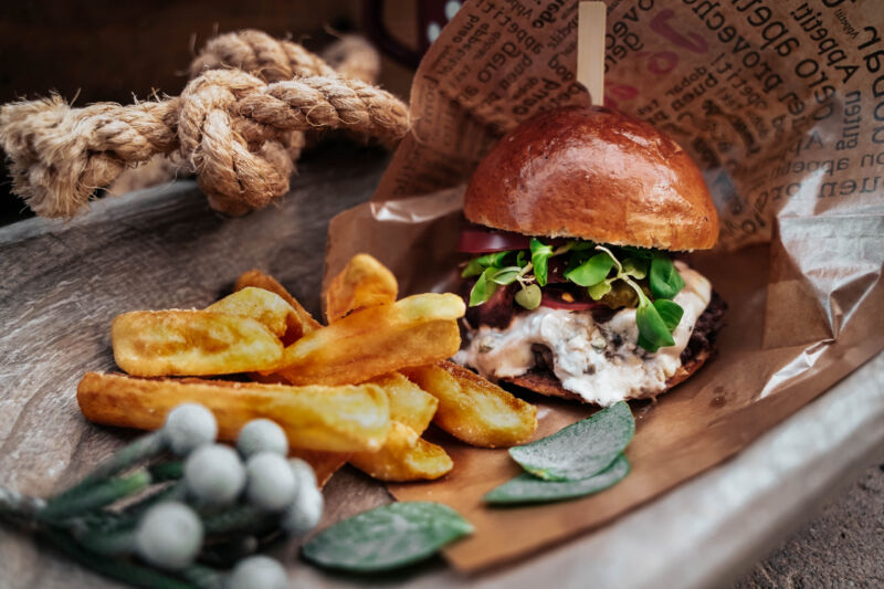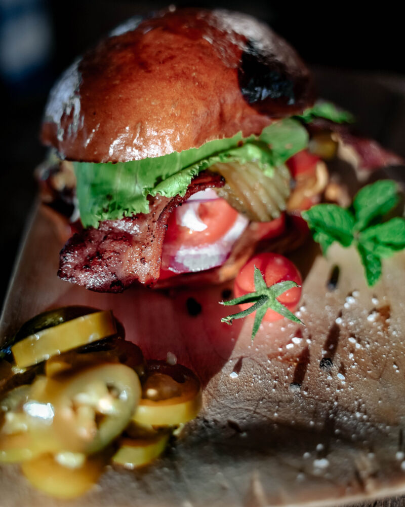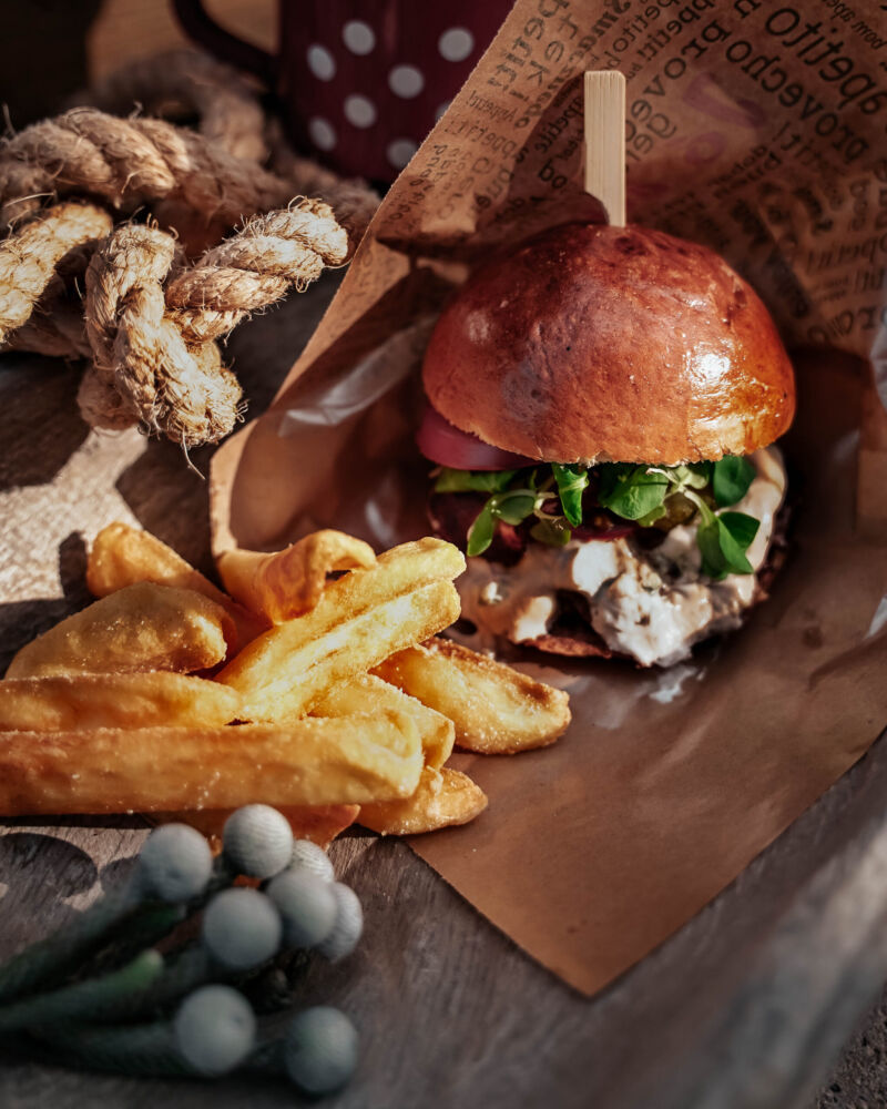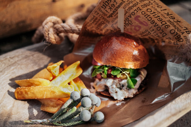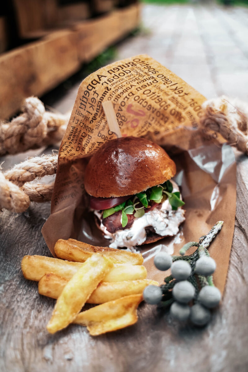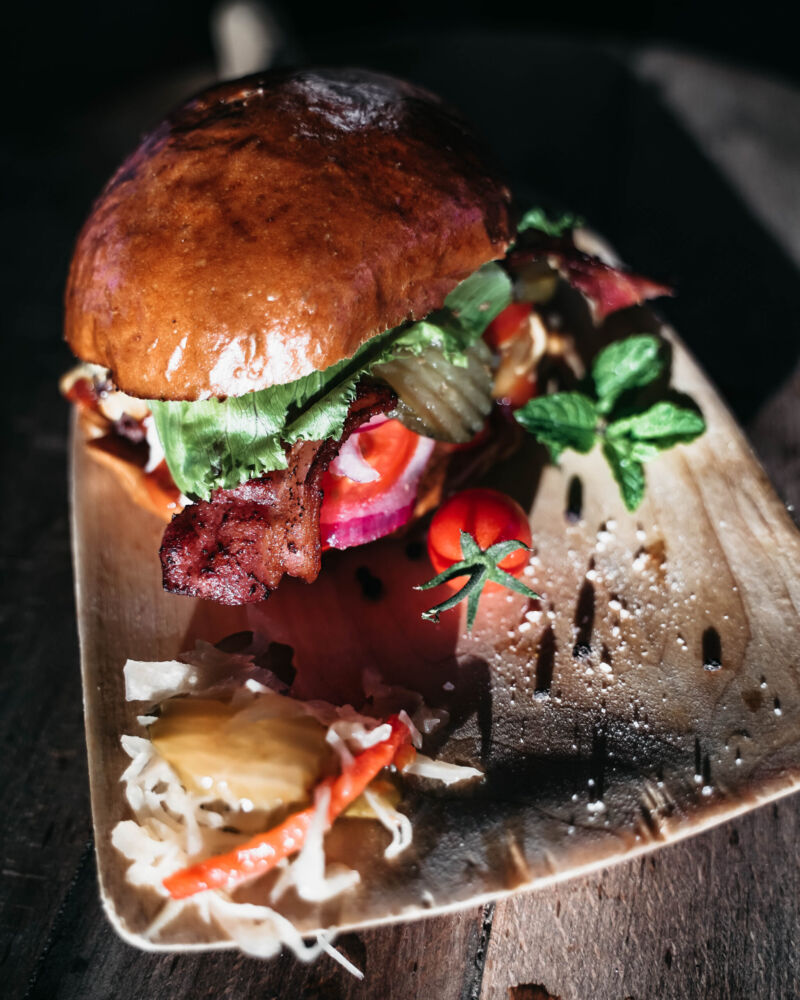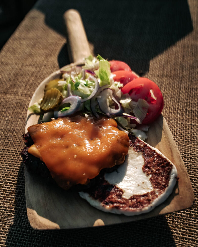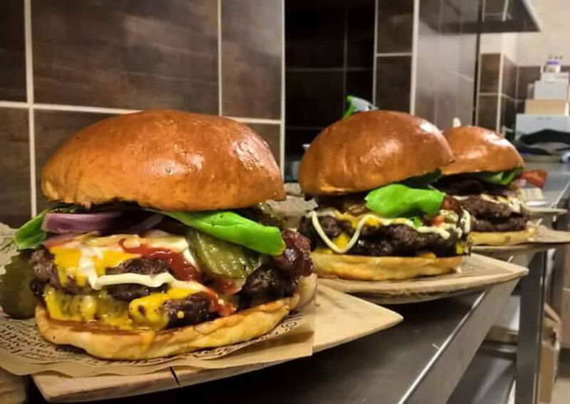 A marhahús a kiindulópont, sok közül a magyar tarka jött be. Nyolcvan százalék nemes marhahús húsz százalék marhavesefaggyúval. A 20 dekás, nyers hamburgerhús be az Amerikából érkezett, időre beállított sütőbe, és csak ekkor fűszerezve borsos, sós fűszerrel. Jöhet egy kis folyékony füst, majd ráolvasztva az érlelt cheddar sajt, számos sajtból ezt találták a legjobbnak. Amerikai mustár, nyolcvan százalékos étolajtartalmú, krémes majonéz, ketchup, hazai paradicsom, savanyú uborka, villámsavanyított lilahagyma, saláta és szinte csörögére sült bacon szalonna. Kívánságra egy kis jalapeno paprika. Ja, és hogy mibe megy mindez bele? Gyulai pékség által sütött minőségi zsömlébe. Megkóstoltuk, valóban street food minőség, vagyis egyedi gyorsétel, melyet gyorsan befalatoztunk, és kaptunk mellé egy kis sült burgonyát is. Itt norvég lett a befutó, de ez is illik egy jégpályához.